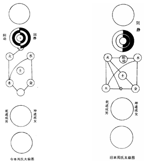 周氏太极图 北宋·周敦颐对上面的“无极图”进行了发展,改造成了“太极图”,并著有《太极图说》。“周氏太极图”有古、今两种图式,今本图式是经朱熹修改过的,流传较广,现将两图录于下: