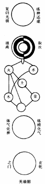 无极图(如左图),传说这就是陈抟所传三图之一。宋·朱熹说:“先天图传之希夷,希夷又自有所传,盖方士技术用于修炼,《参同契》所言是也”(《语类》)。《周易参同契》是早期道家炼丹理论之一,其书说:“大易性情,各如其度;黄老用究,较为可御;炉火之事,真有所据;三道内一,俱出径路。”可见,它是融《周易》理论、黄老学说、炼丹实践为一体的著作。