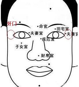 奸门和鱼尾纹处同属胆经区域,都与做爱与情欲相关,奸门位于眼尾与眉尾后方,近似于太阳穴的位置,如果奸门有交叉纹,奸门凹陷,奸门鼓起,奸门有纵纹,奸门有色斑,奸门有恶痣,奸门区狭窄,奸门色暗,这都是欲望深,多纵欲的特征;另外奸门凹陷明显的,这是女人克夫的面相,女人需求多多,男人会因为纵欲而身体亏虚,这样的女人面相属于多次婚嫁的命;奸门有纵纹的,刘恒老师总结的,不一定都是淫欲频繁的,也有没有实际的男女做爱,但是淫欲之心较重,也会在奸门处出现纵纹或者斜纹,这样的男女往往是单身,但是淫心炽盛。
