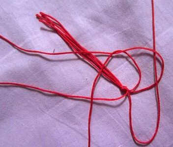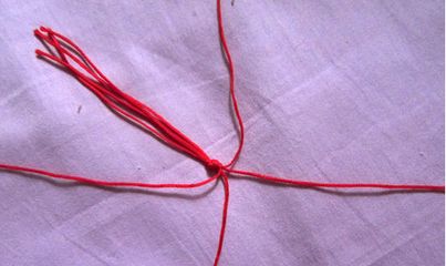 1、首先准备好四条红绳子,在距离线的一头5-6厘米处打个结。