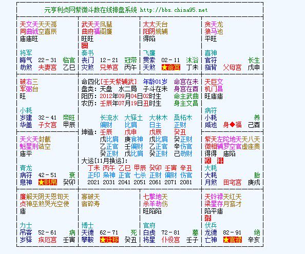 紫微得到左辅右弼, 有力量制化铃星, 铃星不好的影响力较小.紫微有力量时可以解诸星之恶虐(诸星问答论, 全书卷一4页), 无力时就是"擎羊火铃聚,XXXXX"了(诸星问答论).紫微无力制贪狼,卯宫(木)和贪狼相生,典型「桃花犯主」格。这种人若选择了靠群众魅力为生的行业,将是适得其所。这种人若选择了靠群众魅力为生的行业,将是适得其所。依邵崇龄老师书上所述,看极居卯酉格是要以出生当时的「季节」来看。确定出此人是春、夏、秋、冬或四立(立春、立夏、立秋、立冬前十八天之内生)生人后,再依紫贪在卯或酉来判断。只有在春、冬生人,由于冬水生贪狼木,或春木和贪狼同属木,所以贪狼旺克犯紫微土(因紫微此时为弱气)。而且当紫微又无党时,桃花犯主格才成立,您所说的花心也才会成立。若上述条件成立,再看是在卯或酉宫。若在卯宫则会更严重,因为卯为木也。在酉宫则尚知收敛,因为酉为金也。贪狼代表桃花,但是呆在紫微星身边时其凶性大减,仅代表主命较有异性缘,而对感情举着不定,而给人不确定感.紫微属阴土, 贪狼属阳木, 「木克土」, 紫微「土」庄重、矜持、厚实稳重的性格, 被贪狼「木」激情好动所冲动,矜持、厚实稳重的性格, 被贪狼「木」激情好动所冲动,整个人也就显得活泼而热情扬溢。古书上说, 紫贪会命为「桃花犯主」, 尤以居卯酉同宫时为最; 而「桃花犯主为至淫」, 此句话也为免太过武断,在古时封闭的社会中, 男女对感情有较多的表达就会被认为浪荡, 但以现今的社会来说, 只能说此种人较浪漫多情, 感情丰富罢了。而当贪狼逢红鸾、天喜、天姚、咸池四星时, 其「桃花」、「物欲」的性格才会彻底被引发出来。紫府夹命我不觉得怎么好, 况且诸星问答论说紫微入相貌(父母宫)为陷宫, 主人劳碌作事无成, "虽得助亦不为福".微一星, 可以用" 自 "一字来发展, 如, 自尊,自制,自重,自我,自以为是,自大,自夸,自我期发展,自我期许高,….. 又如天机星, 我们可用" 机 "字来发展, 因此机动,机敏,机心,机智,机谋,又如: 机车, 收音机, 打字机, 机器,…..