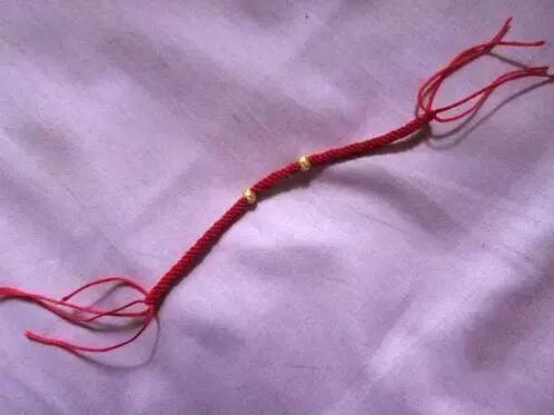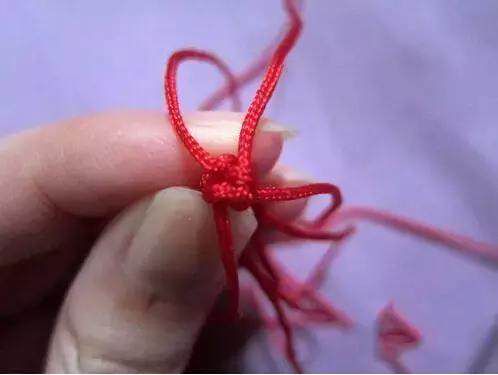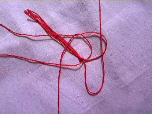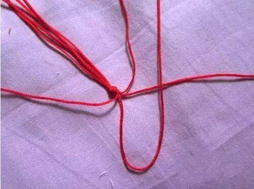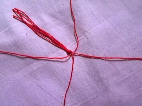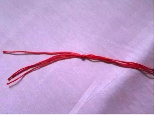 1首先准备好四条红绳子,在距离线的一头5-6厘米处打个结。
