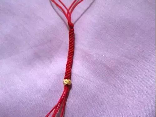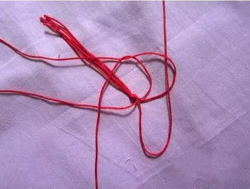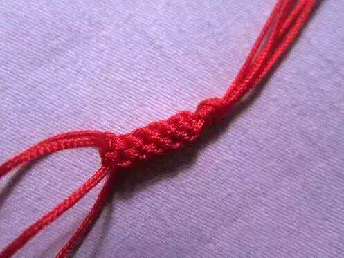 3、让红色线互相压着相邻的一根红绳,第一根压第二根,第二根压第三根,第三根压第四根。