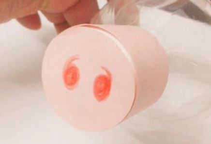 9、把小尾巴剪下来,粘在小猪的尾部。再用黑笔在纸上画上两只小眼睛,剪下来,粘在瓶子上,可爱的小猪就做好了。