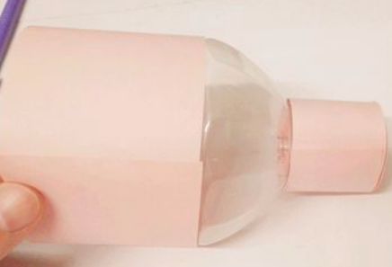 7、再剪一段和瓶身一样宽的纸条,围在瓶身上,用胶棒粘好,当小猪的身体。