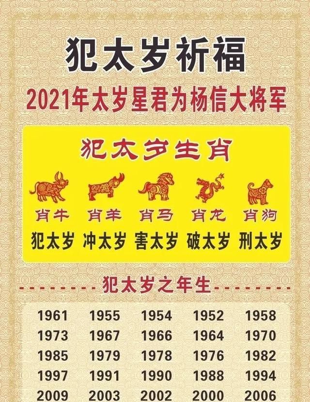 在道教的信仰中,每年都有一位轮值太岁星君在主管着世人在全年的方方面面。依人的生肖会有值、刑、破、冲、害等冲突关系,也就是我们常说的犯太岁。