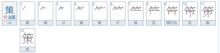 组词:政策、鞭策、策略、策论、策励等。