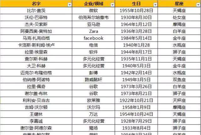 从统计数据来看,狮子座以6人险胜其它星座,居富豪星座排行榜首位。金牛座、双鱼座、水瓶座、天蝎座,分别以5位富豪仅次于狮子座,位居榜眼的位置。从行业来看,这四大星座也是各行各业全面开花,从软件、社交到钢材运输等无不涉猎。他们有的造就了举世瞩目的成就,有的在潜力领域出类拔萃,发现别人还未发现的价值一步步做大做强。