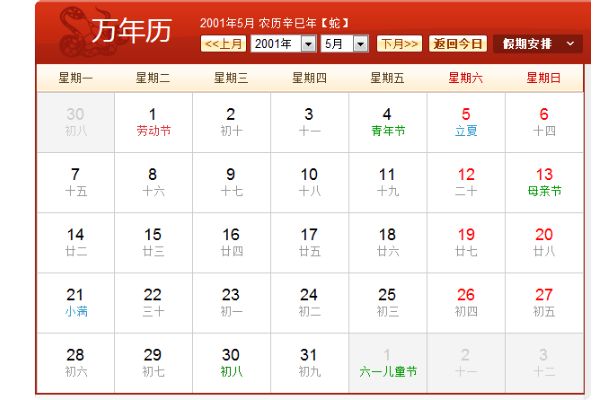 阳历2001年5月农历辛巳年(【生肖:蛇】中华人民成立52年