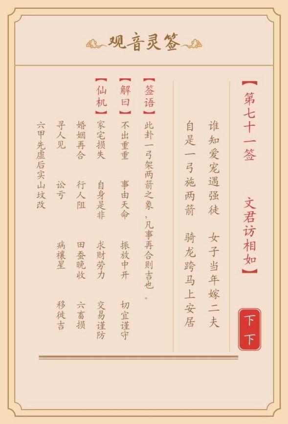 观音灵签第七十一签文君访相如是一个下下签,签文示意目下虽有困难,但是终有拨云见日知识。只要勤劳,尽人事,能有所成。