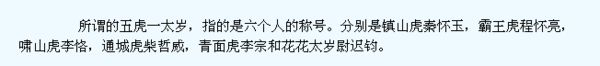 镇山虎秦怀玉,霸王虎程怀亮,啸山虎李恪,通城虎柴哲威,青面虎李宗和花花太岁尉迟钧