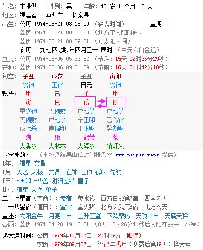 例如:某男于公历1974年5月21日08时15分在福建省漳州市长泰县出生,其生辰八字是:甲寅 己巳 壬戌 甲辰.这个八字中的日支(戌)与时支(辰)是相冲的.