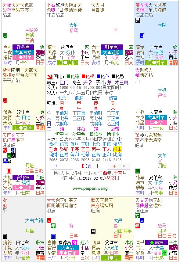 一般来说,生辰八字算命,只批断大运的运势情况,能够批断到流年、流月的已经相当精细了。如果想成为一个专业命理预测话,是应该有必要懂得推算流月流日流时的。因此大多数八字排盘软件都没有排流月排盘、流日排盘、流时排盘功能。如果自己不会排流盘的话,可以使用信达利在线排盘工具来进行排盘。下面举个例子来说明一下:某一男命出生于农历 一九八六年五月初九日 下午2点,他的生辰八字是:丙寅 甲午 庚寅 癸未。如果要他看今天(公历2023年2月5日,对应的干支是:丁酉年 壬寅月 癸亥日)的运气情况的话,那就需要用到流日命盘去分析这一天的运气情况。