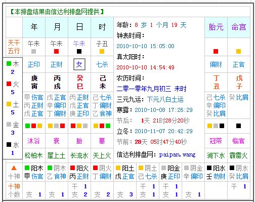 2010年10月10 日下午15 点05分出生在湖北武汉的生辰八字是:庚寅 丙戌 癸巳 己未。八字五行齐全,不缺少任意一种五行。