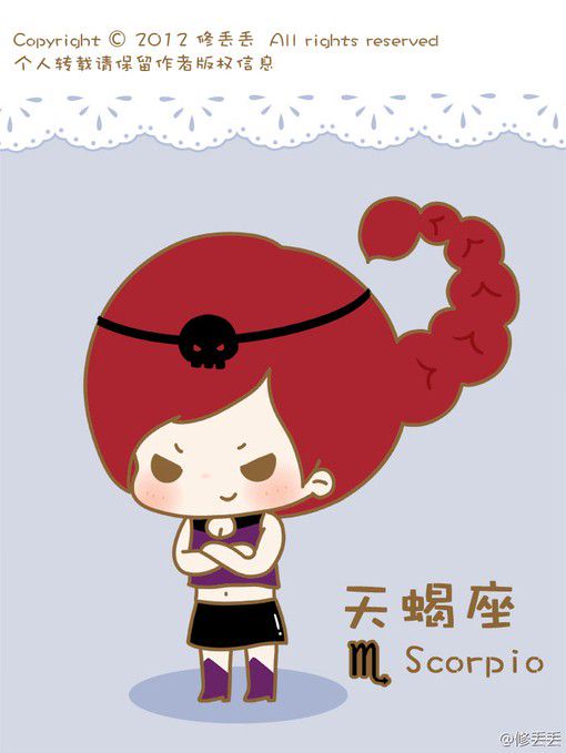 天蝎座(10月24日-11月22日):图片上的小男孩头顶蝎子,衣服上画着天蝎座标志,天蝎座是十二星座中智商最高的星座,心思缜密,观察力强,对复杂的事物都能通过观察洞悉全局。