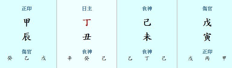 十神为正印:其表象范围大多与学业、艺术,以及长辈、师长、母亲、女婿等有关。
