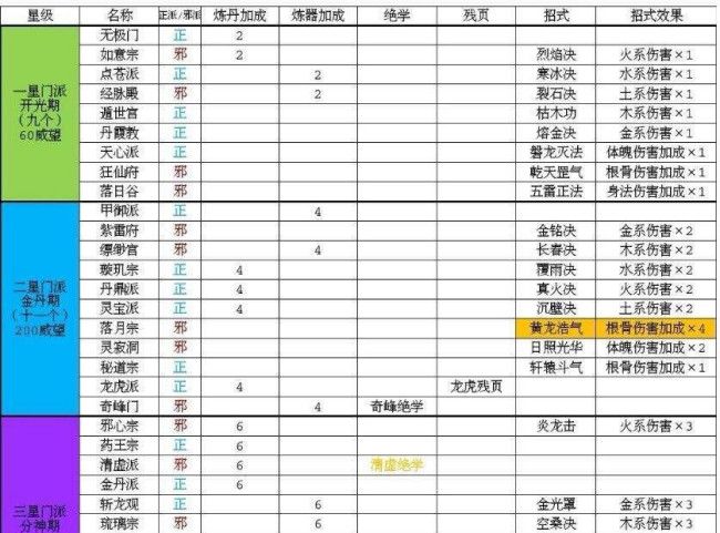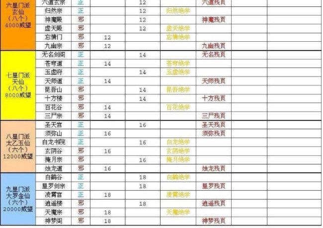 玄元剑仙门派按星级划分为7个,其中1-5星级为招式学习门派,分别有点苍派、飘渺宫、昆仑派等;6、7星为绝学残页学习门派,有万灵山,百花谷等。