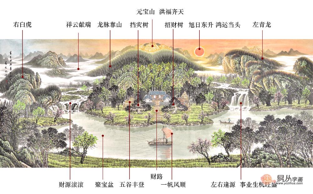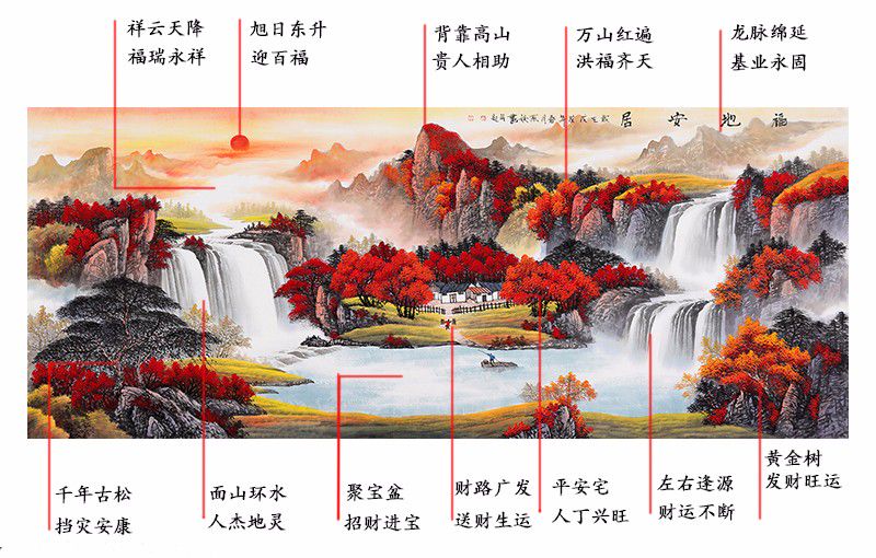 这是一幅风水字画, 此作品是按照风水师指点布局并创作的,为典型的“左青龙、右白虎、前朱雀、后玄武”的风水布局。画面中的太阳代表旭日东升鸿运当头,事业蒸蒸日上。流淌的瀑布代表着财源滚滚、生生不息的含义,下面的溪水汇流形成聚宝盆的形状,意味着水不外流,即财不外流,也就是招财聚宝盆。