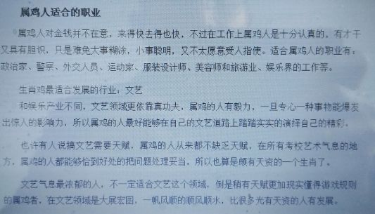 属鸡之人大都有良好的声誉。他们知道如何用自己的智慧,高效率的工作,并赢得主管的信任。任何类型的属鸡之人,去做那些普通的工作时,会在这些工作中找到自己的重要价值。属鸡之人在普通岗位上会获得荣誉,得到报酬,会有很不错的发展。但如果是属鸡之人不愿意去做的事情,他们不会尽一点儿的力量。
