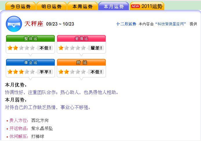 整体运势:相较于过去一年多的折腾、恓恓惶惶的日子,2010年天秤座的你将过得比较踏实,知道自己要面对什么,需要做些什么,对未来比较有方向感,虽然前景仍然有不少变量等着你,但是至少你的心态上比较沈稳了,同时,某段时间事情多、状况多,会把你搞得很累,但是你会激发起斗志咬牙撑过去,尤其是在4月到7月中旬,天秤座的你得多加留意哦!