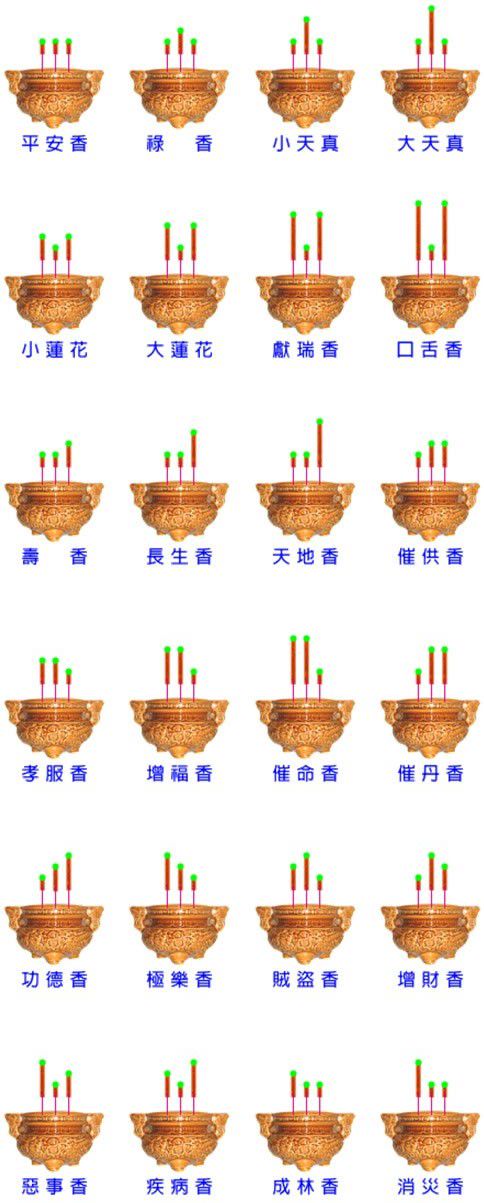 1、靠右的香头高于左手边和中间的香头,且左手和中间位置的香头持平,这个称为:天地香;2、靠左的香头高于右手边和中间的香头,且右手和中间持平,这个称为:消灾香;3、左右都低于中间,但左右持平,这个称为小天真香(意为有佛祖降临);4、中间香最高、右手次之、左手最低的,称为增财香.