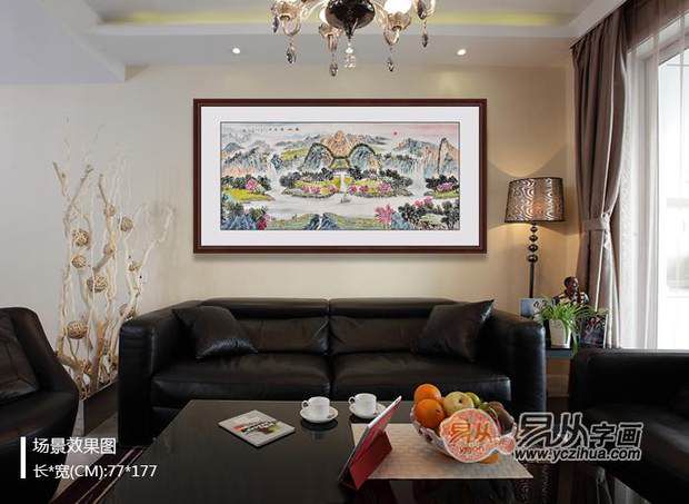 6、 山水画:山水字画摆法较为讲究,一般适合摆在全屋座方(门的另一方)或居室坐椅、睡床位置的左手边;山势平圆的字画亦可挂在书桌后面作为“靠山”,能增加贵人运。易挂在客厅、会议室、办公室的座椅后等。