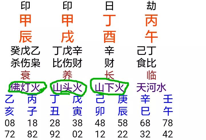 上图的八字是马云的,喜用火木。八字里有覆灯火、山头火、山下火,助起八字的火势。覆灯火是油灯之火,山头火是草木旺火,山下火是萤火,所以山头火>覆灯火>山下火。山头火作为用神在月柱门户用神有力,八字富贵层次大增。