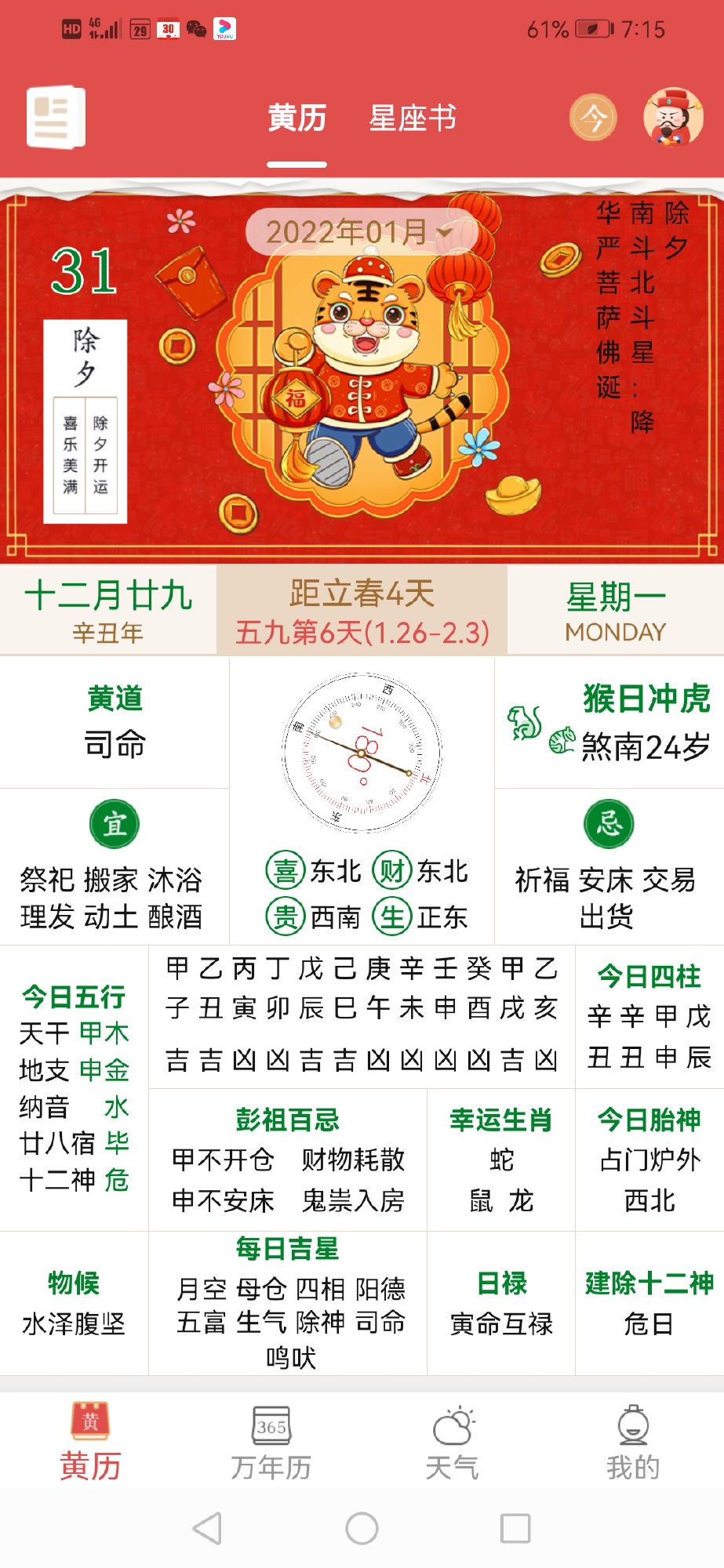 年01月25日 农历12月(大)25日 星期六 冲虎(庚寅)煞南