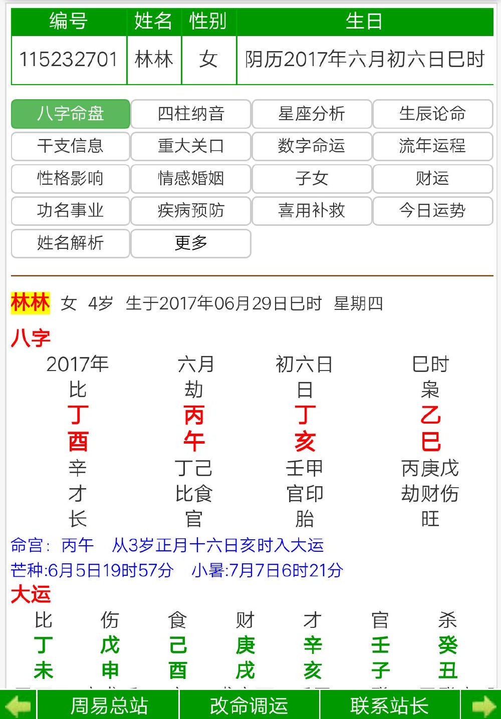 其主要提供八字排盘、五行十神强弱及用神喜忌评断、个人性格、学业、事业(包括适宜职业及行业)、财运、婚姻、六亲关系分析、姓名测试,同时提供一生的运气趋势分析。