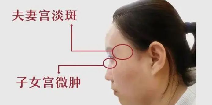 面相的夫妻宫位于眼睛的尾部,太阳穴的位置。人的面相形态不同,但是这个部位,无论男女,夫妻宫的颜色和凹凸表示感情婚姻的美满与否。这个部位如果色泽光润,丰隆平满,表示婚姻美满;如果这个部位焦黑,或有十字的立纹,表示夫妇无缘。