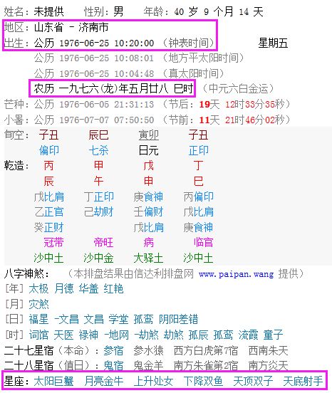 第二种方法是:可以在你的个人电脑或智能手机中下载、安装一个专业的占星软件,也可以直接使用网站上的星座(或星盘)在线排盘工具来进行查询。你只要输入自己的出生日期、时间、出生地区等信息后,就可以快速准确地知道自己的太阳星座了,有些软件还可以自动生成星座命盘,还可以计算出月亮星座、天底星座、下降星座、天顶星座、上升星座、土星星座、木星星座、火星星座、金星星座、水星星座、冥王星星座、天王星星座、海王星星座等信息。如果你只知道自己的阴历(农历)生日且使用仅支持阳历生日方式的占星软件来查询的话,就需要先用万年历(或阴历与阳历日期转换工具)来查出你的阳历生日,再进行查询星座。如果你使用的是支持阴历生日来查询星座功能的软件,它会把阴历日期自动转换为阳历日期,甚至还可以把你输入的出生钟表时间和地区信息自动转换成精确的天文学时间来计算出星座相关信息。另要注意:如果你的出生时间是属于中国实施夏令时间段范围内的,要换算为标准的时间,即是将出生的夏令时时间要减去一个小时,例如是在下午四点半出生,实际上应为下午三点半出生,否则可能造成查询出来的天顶星座、上升星座、月亮星座、下降星座等信息是错误的。 比如,某男子于农历 一九七六年五月廿八在山东省济南市出生,用在线排盘工具查出他的星座是:太阳巨蟹、月亮金牛、上升处女、下降双鱼、天顶双子、天底射手。