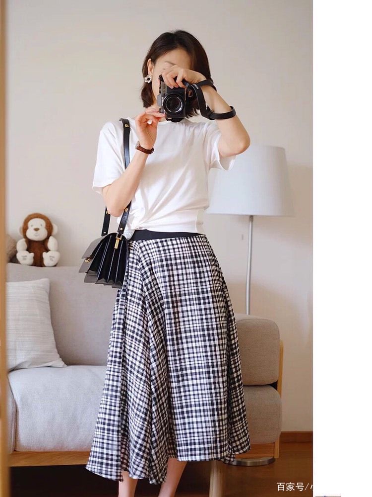 看一下这名博主,仅仅用基础款的白t和格子呢的A字裙就能凹出成熟女性的优雅与气质。值得提的是如果是常规款上衣还记得把衣摆塞到下装里,更显精神的一起打造出好占比。或是像模特那样把T恤打个结,休闲娱乐随心所欲超自然!